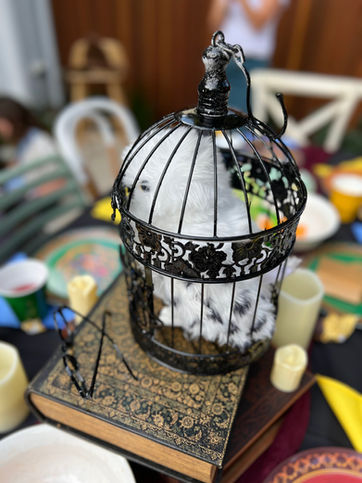 Caged Hedwig and 2 x books, with flameless candle centrepiece, glasses